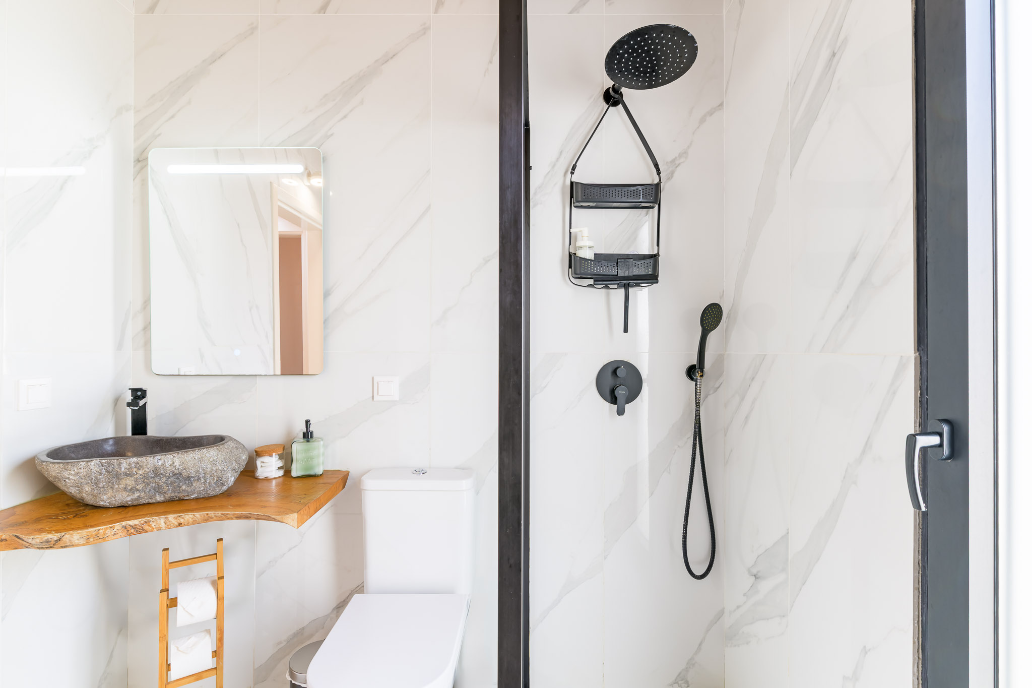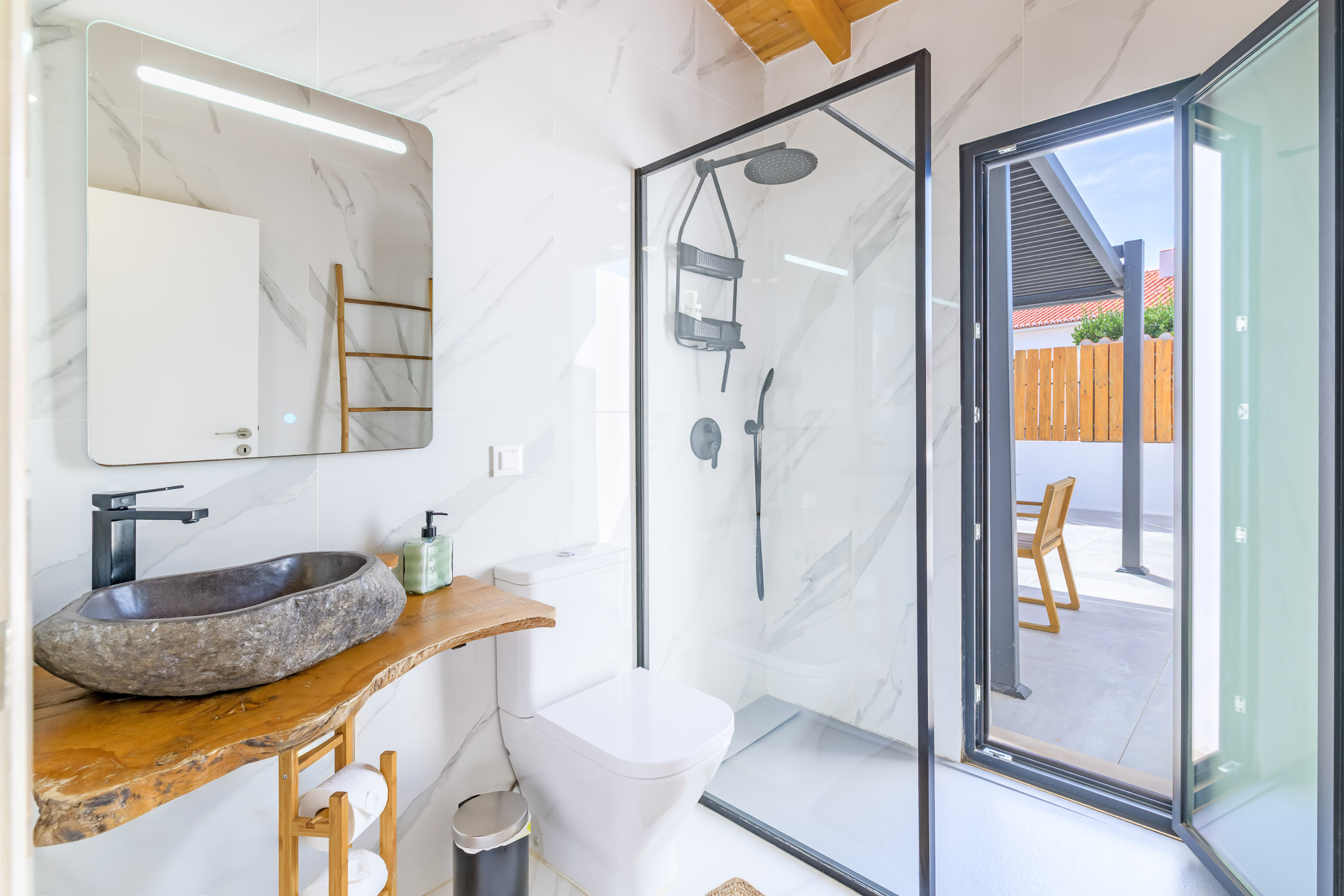 Uma casa de banho equipada com duche, sanita e lavatório, além de toalhas, gel de banho, champô, condicionador e creme de corpo.