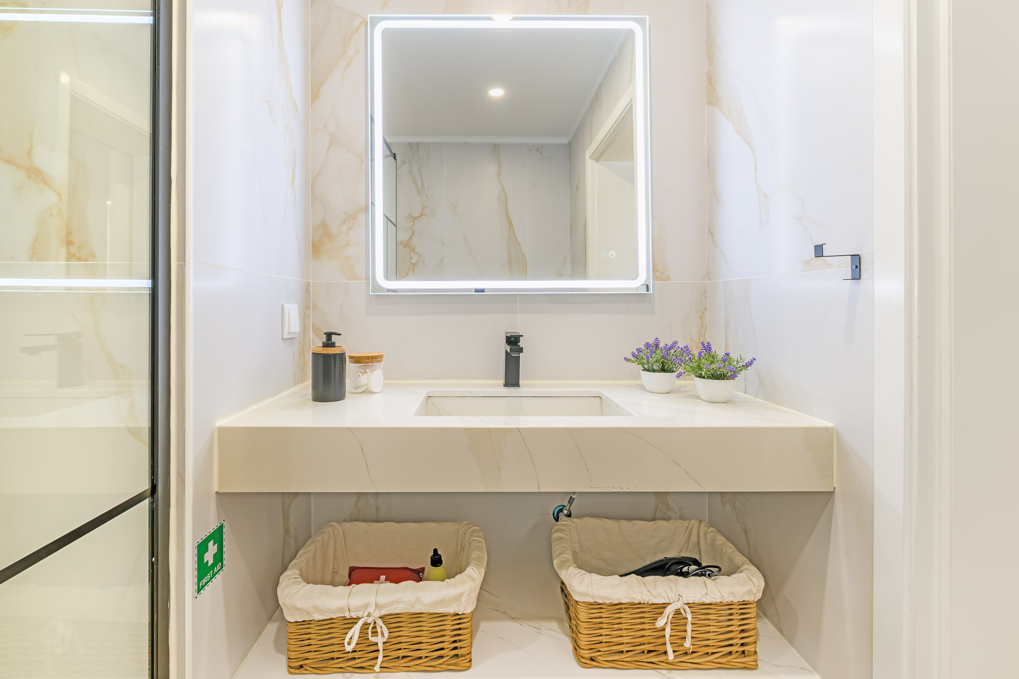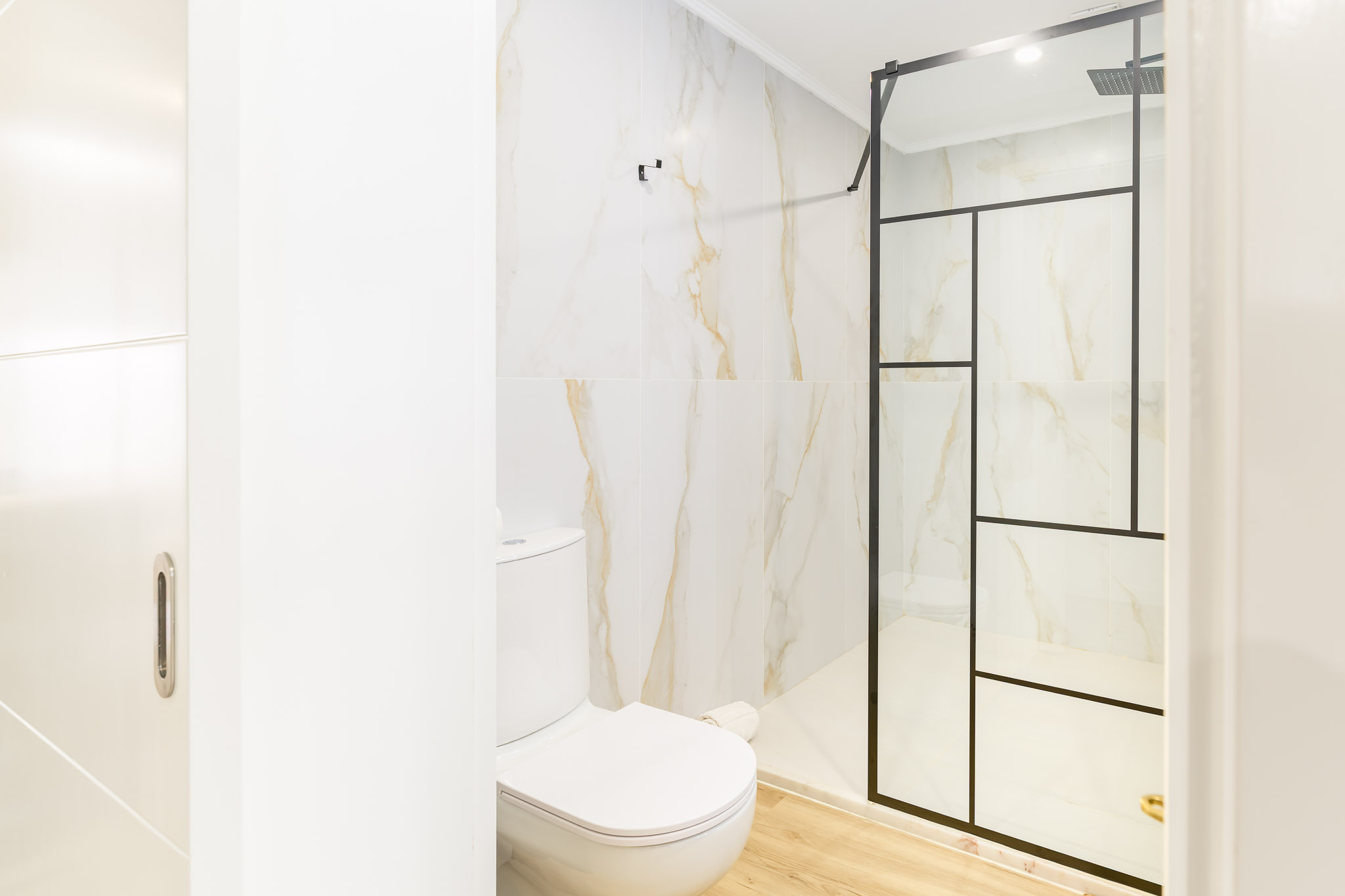 Uma casa de banho equipada com duche, sanita e lavatório, além de toalhas e com imenso espaço para relaxamento.