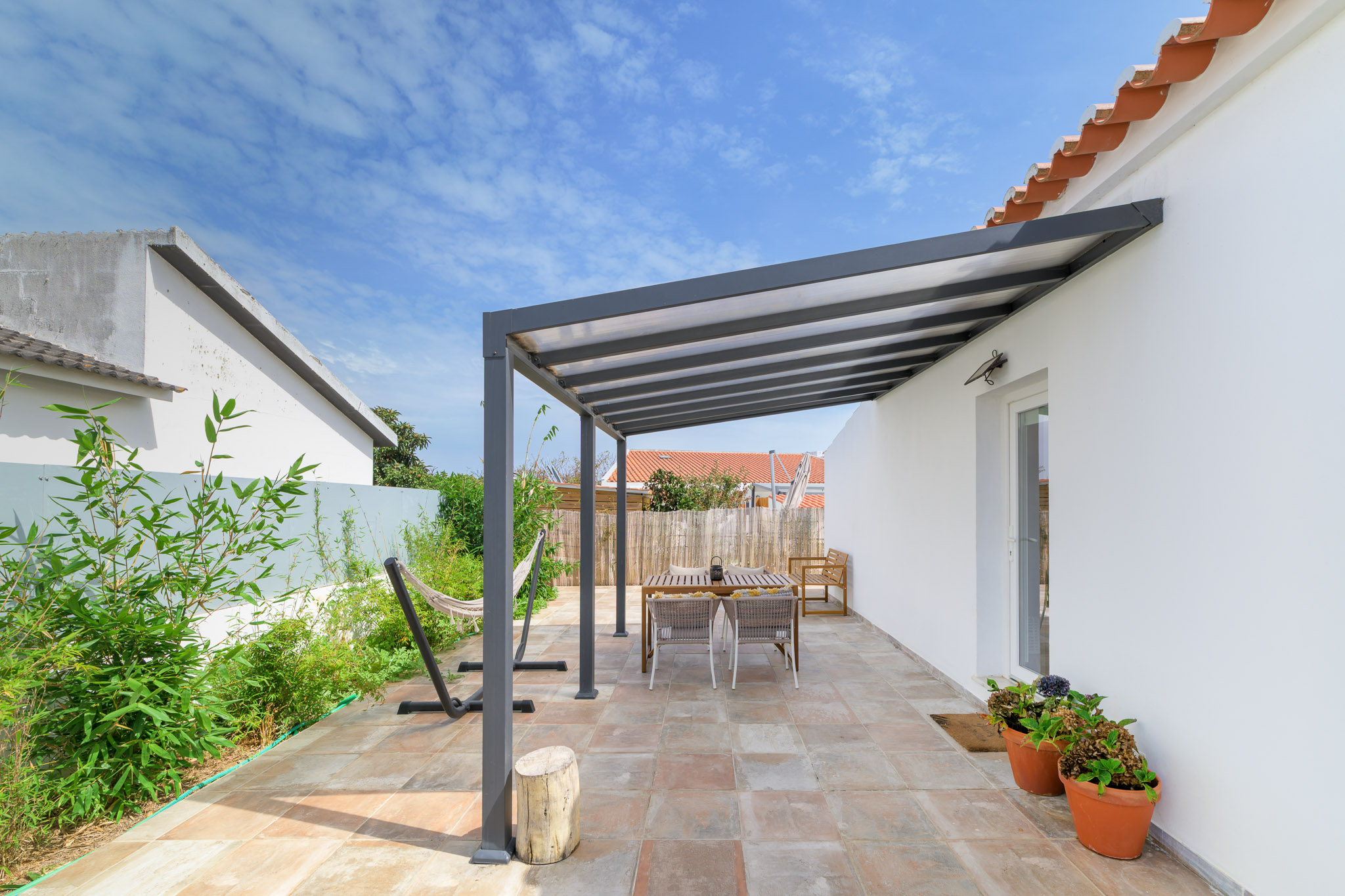 Um espaço exterior privado com churrasqueira, perfeito para desfrutar de refeições ao ar livre.